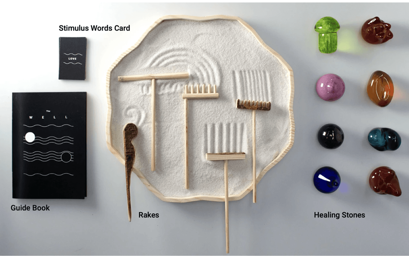 A self-care healing kits that integrating art therapy and zen mediation. These kit helps increase self awareness, mindfulness. Raking the sand and creating swirling patterns of your mind and