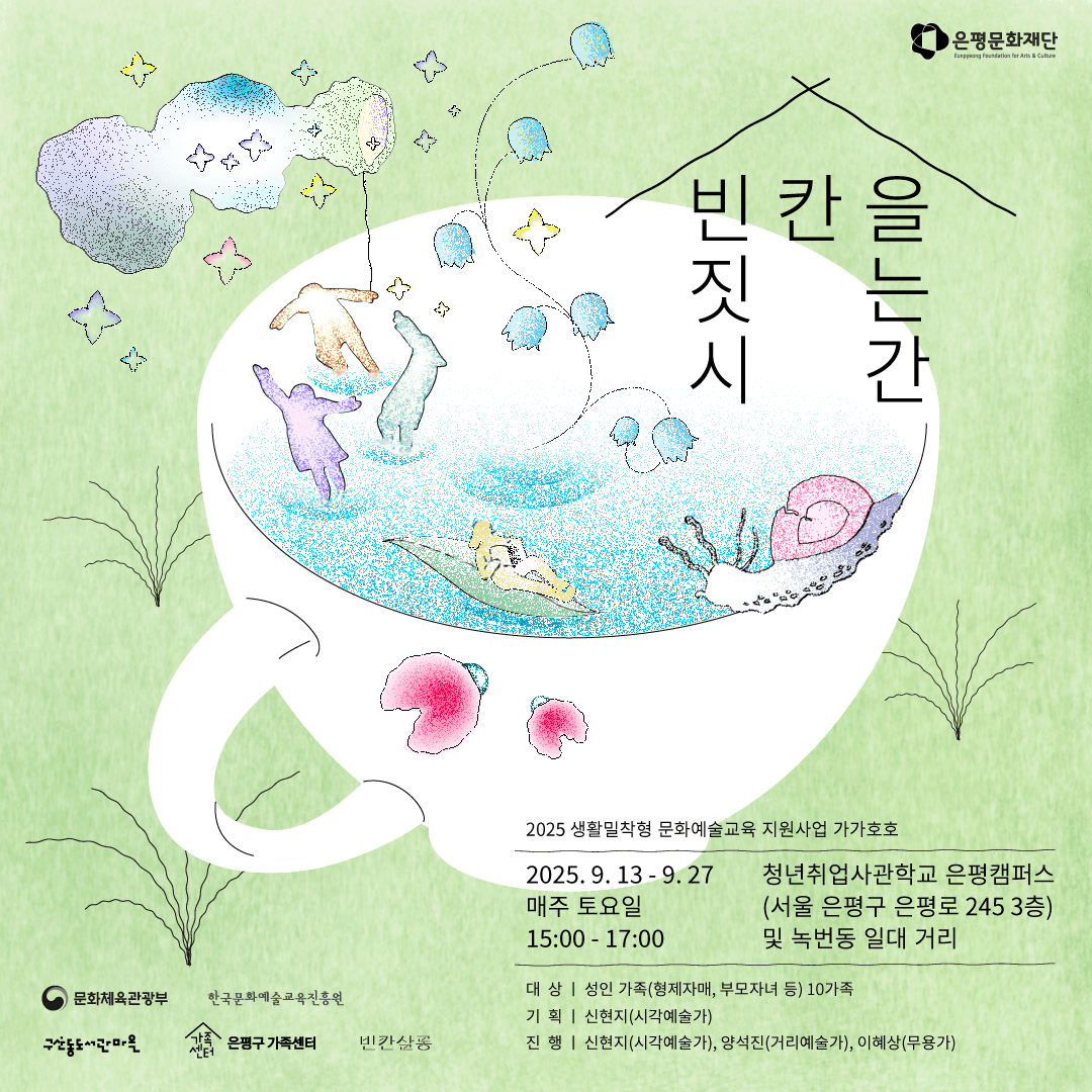 A promotional poster for a five-week community arts workshop by artist Shin Hyunji, inviting adults and families to explore their inner stillness through tea, poetry, movement, and street performance. The illustration centers around a teacup, capturing the essence of the workshop — figures in motion, everyday objects collected from the streets, and the quiet act of building one's own "blank space."