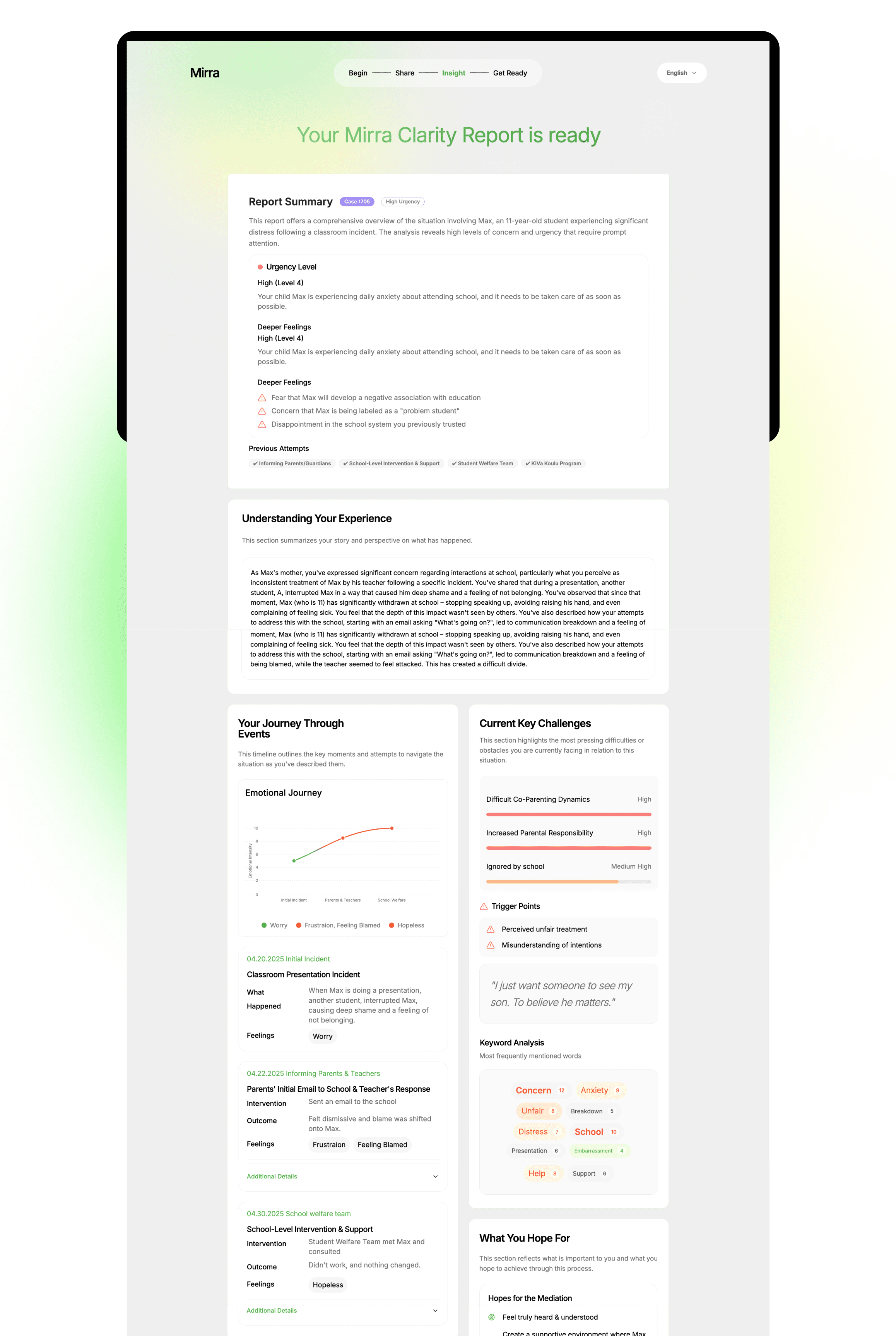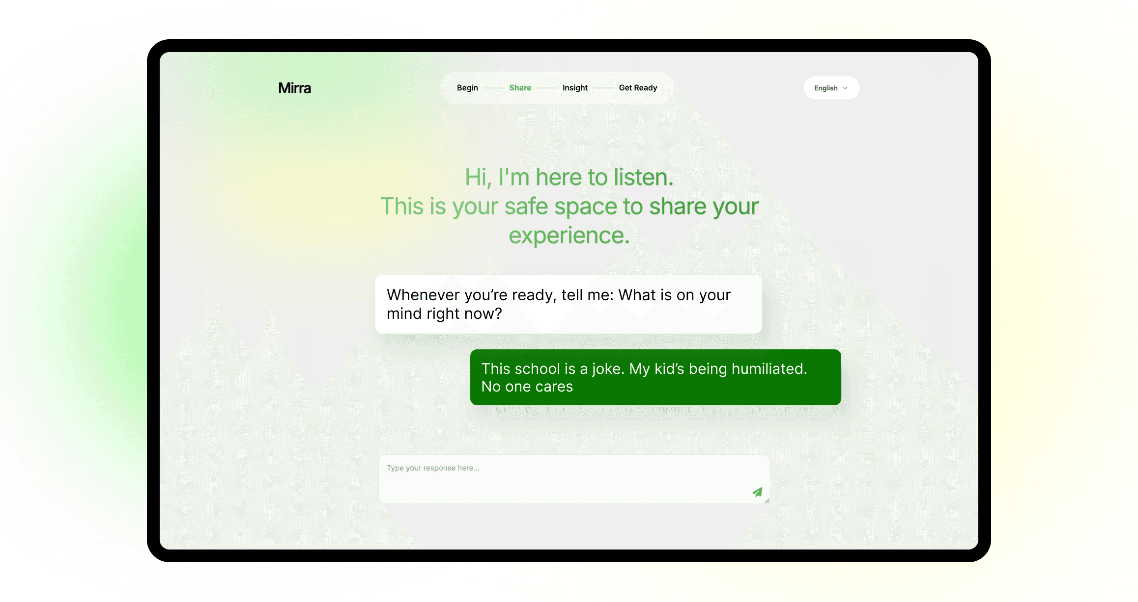 Mirra uses a Large Language Model (LLM) to analyze what users write — such as parents or teachers involved in conflict.